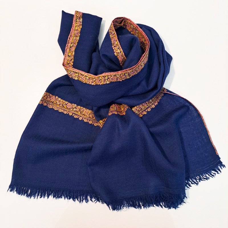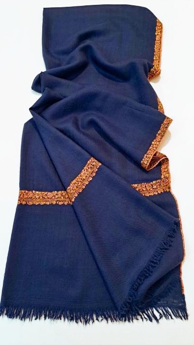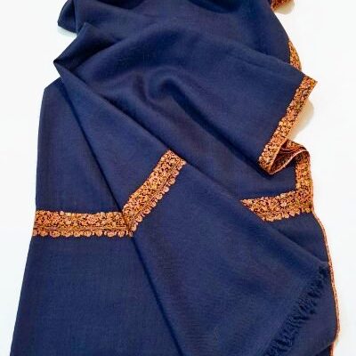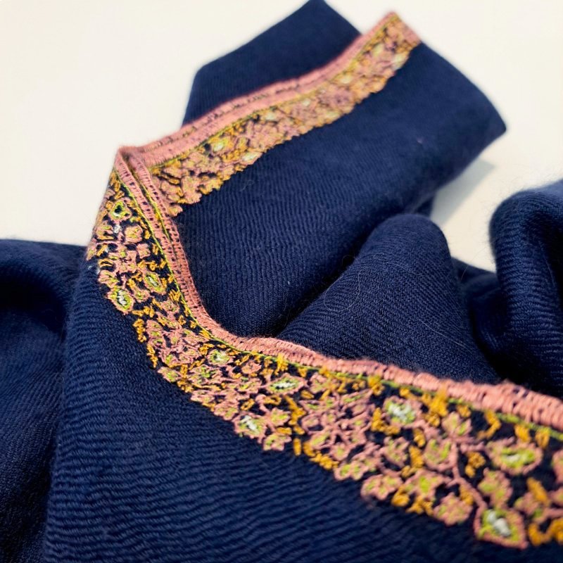 Le Hashia (pourtour brodé) de l’étole Pashmina Bleu Nuit est orné de délicats motifs floraux méticuleusement brodés à la main. Le champ, d’une belle teinte bleue, est le résultat d’un tissage à la main en sergé, offrant une qualité subtile et raffinée.