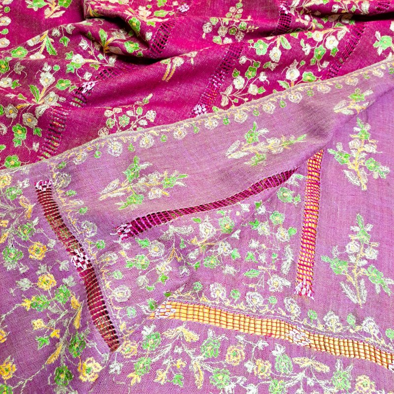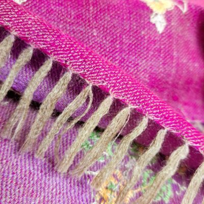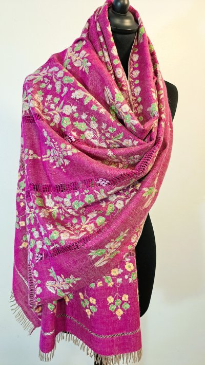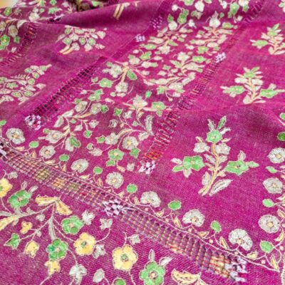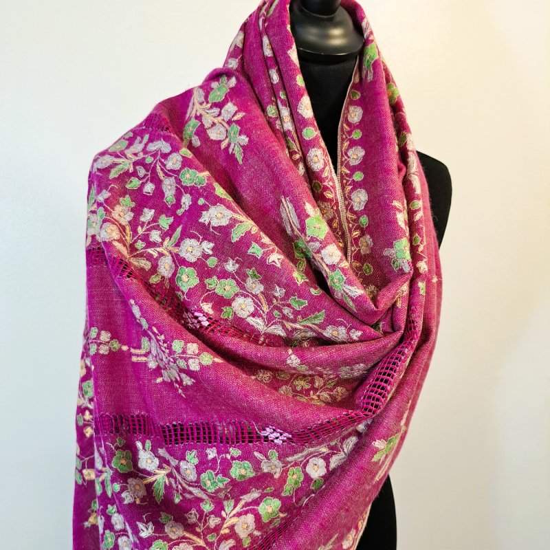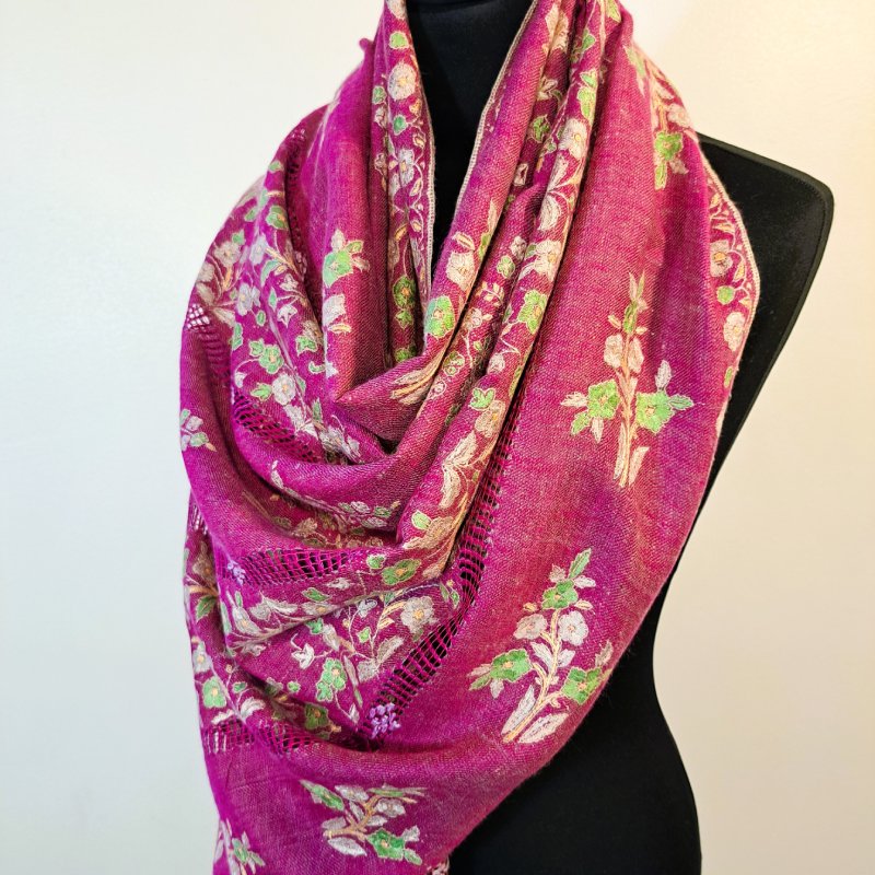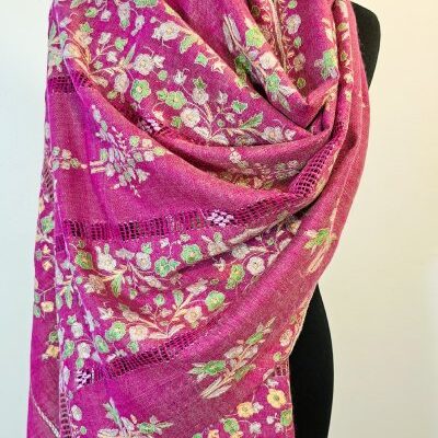 Entièrement tissée et brodée à la main, l’étole Pashmina Papier Maché est réalisée en pashmina pur, dans le respect du savoir-faire traditionnel cachemiri. Son champ en sergé, de couleur rose fuchsia, offre une base lumineuse et éclatante qui met en valeur la richesse de la broderie. Le motif floral, riche et délicat, s’inspire du style papier-maché. Il s’étire sur toute la longueur de l’étole en bandes verticales de bouquets, séparées par de fines bandes ajourées, créant un rythme harmonieux et aérien. Au total, cinq bandes brodées alternent avec quatre lignes ajourées, offrant à la fois densité et légèreté dans la composition. La bordure de couronnement, haute d’environ 14 cm, reprend les mêmes motifs floraux que le champ, pour un effet structuré et raffiné. Les couleurs de la broderie – bouton d’or, vert prairie, rose pervanche et blanc – contrastent délicatement avec le fond fuchsia, mettant en valeur chaque bouquet et détail floral. Les lisières sont finies au point de feston, tandis que les laizes sont ornées de frangettes de 3 cm, soigneusement nouées à la main pour un effet structuré et élégant, qui souligne la sophistication de l’étole. Légère mais dense, l’étole Pashmina Papier Maché mesure 70 × 190 cm pour un poids de 185 grammes.
