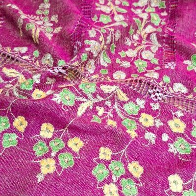 Les couleurs de la broderie – bouton d’or, vert prairie, rose pervanche et blanc – contrastent délicatement avec le fond fuchsia, mettant en valeur chaque bouquet et détail floral.