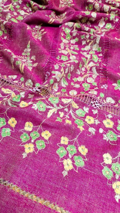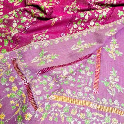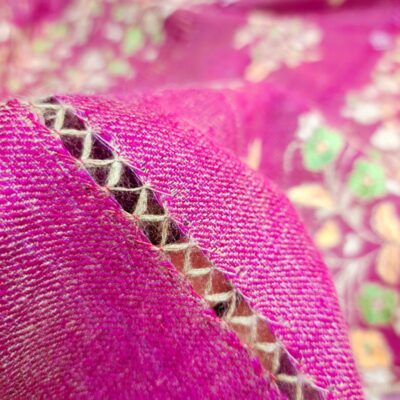 Entièrement tissée et brodée à la main, l’étole Pashmimna Papier Maché est réalisée en pashmina pur, dans le respect du savoir-faire traditionnel cachemiri. Son champ en sergé, de couleur rose fuchsia, offre une base lumineuse et éclatante qui met en valeur la richesse de la broderie.